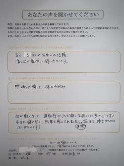 これまでの経緯や不安な気持ちヲじっくり聞いてくださり、身体のチェックをして頂いたところかなりゆがみがある事がわかり、治療していただき楽になりました。